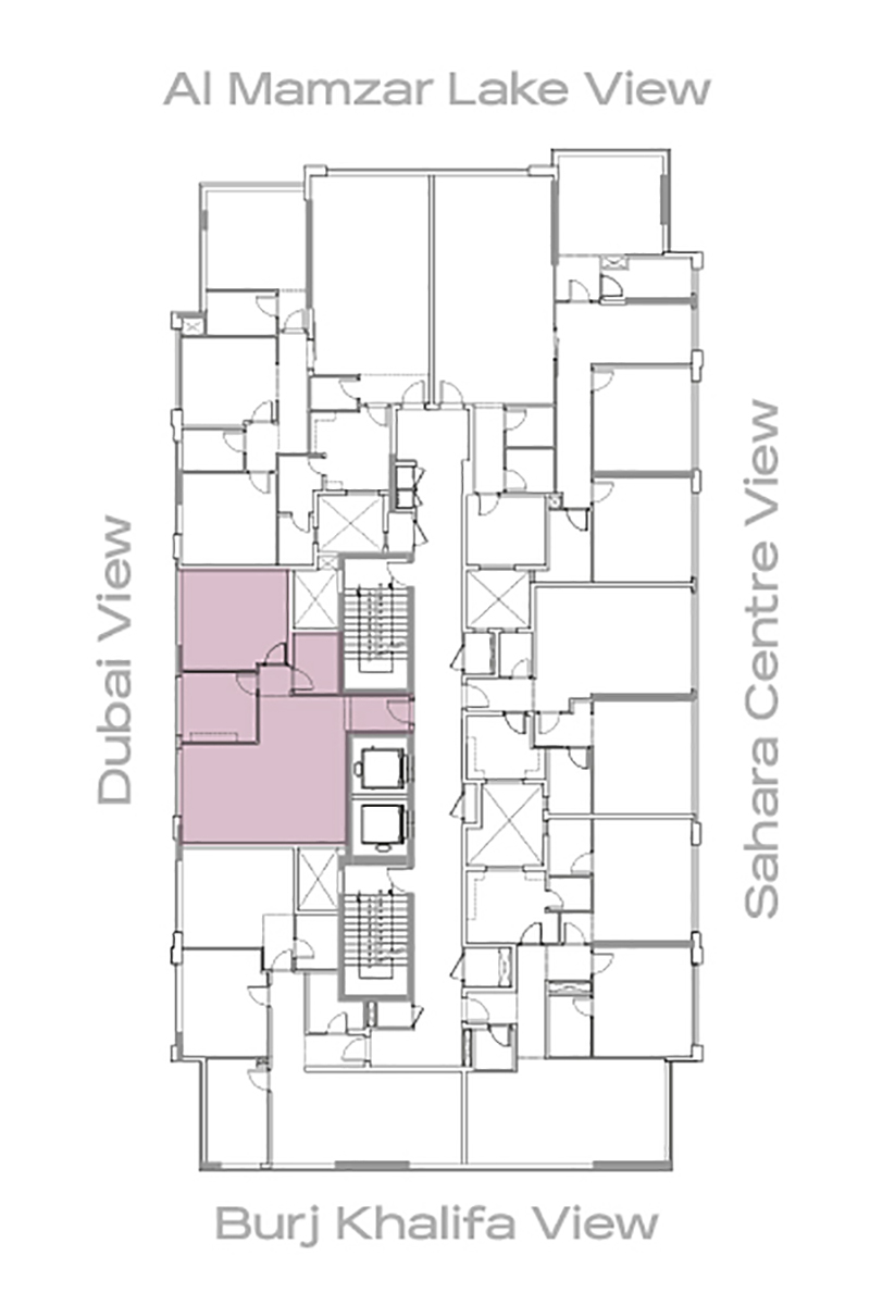 The 1BR Type B-3 floor plan at Sahara Tower 6 offers a smart 980 sq.ft. one-bedroom layout near the Dubai–Sharjah border. A bright L-shaped living and dining area sits at the front of the apartment, giving plenty of space for a full sofa setup and family dining table. The enclosed kitchen is positioned just off the living room for easy serving, while the bedroom is tucked away on the quieter side with built-in wardrobes and direct access to the main bathroom. With its long entry corridor and clearly defined zones for cooking, relaxing, and sleeping, this layout suits singles or couples who want a calm, easy-to-furnish home.