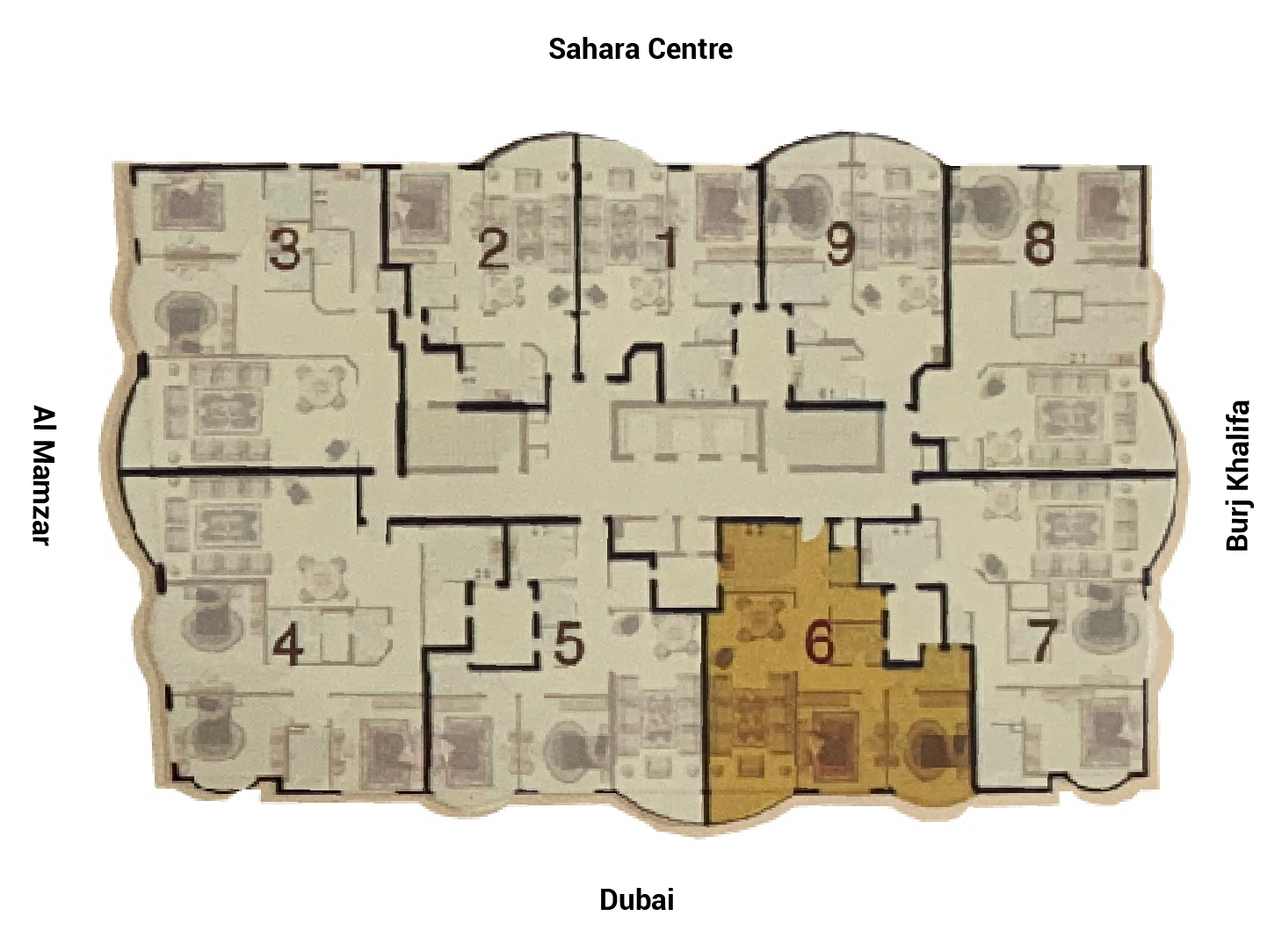The 2BR – Type 6 floor plan at Sahara Tower 1 is a well-planned 1,450 sq. ft. two-bedroom apartment in Al Nahda, Sharjah, ideal for small families who want extra utility space. A wide entrance leads to a large living and dining room opening onto the balcony, while a separate closed kitchen sits near the entry. The layout includes a comfortable master bedroom with en-suite bathroom, a second bedroom beside the shared bathroom, plus a maid’s room with attached toilet and an additional guest toilet for convenience.